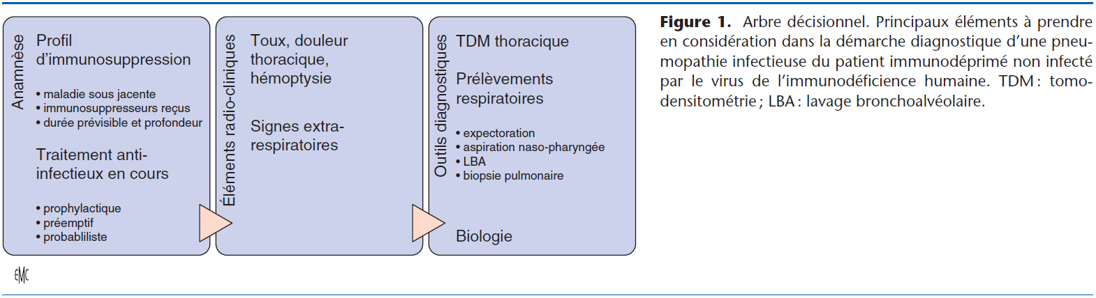 Hussenet C, Tazi A, Bergeron A. Pathologie infectieuse pulmonaire de l’immunodéprimé (hors virus de l’immunodéficience humaine). EMC - Pneumologie 2016;13(2):1-13 [Article 6-004-A-30].