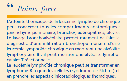 — Résumé basé sur Chagnon K., Bergeron A. Pneumopathies des hémopathies malignes hors pneumopathies infectieuses et médicamenteuses. EMC (Elsevier Masson SAS, Paris), Pneumologie, 6-062-C-10, 2011.