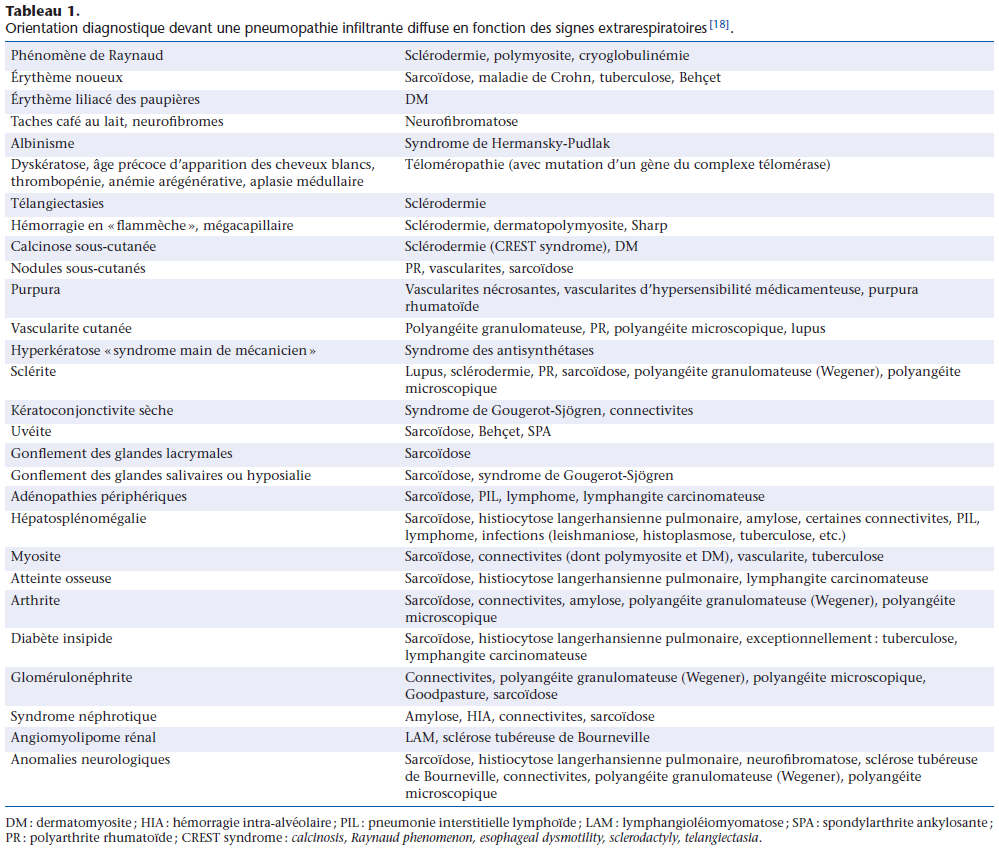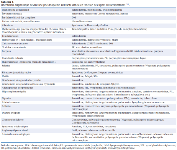 - Signes extra-respiratoires : sont nombreux et ont une grande valeur d'orientation (cutanés, vascularites, ophtalmologiques, ORL, neuro-musculaires, articulaires, diabète insipide, rénaux…)